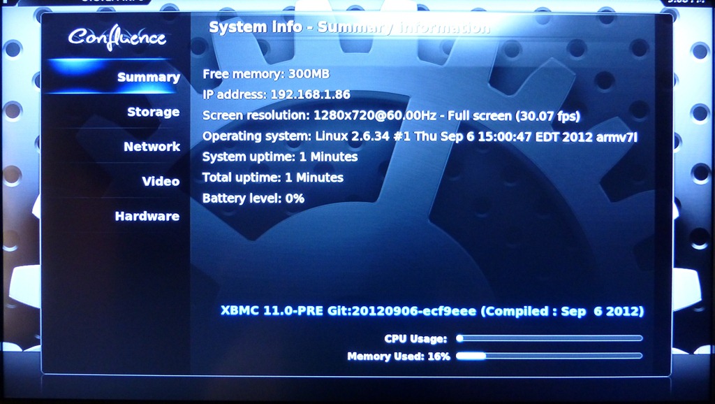 I tested a variety of media formats, all in MKV containers, and all played without issue. I did not test DTS, DTS-HD, AC3, and TrueHD passthrough, as this build of XBMC is based on v11 Eden that does not support HD audio (included in the unreleased v12 Frodo), and I had the box directly connected to a television over HDMI, so all audio was downmixed to two channels.