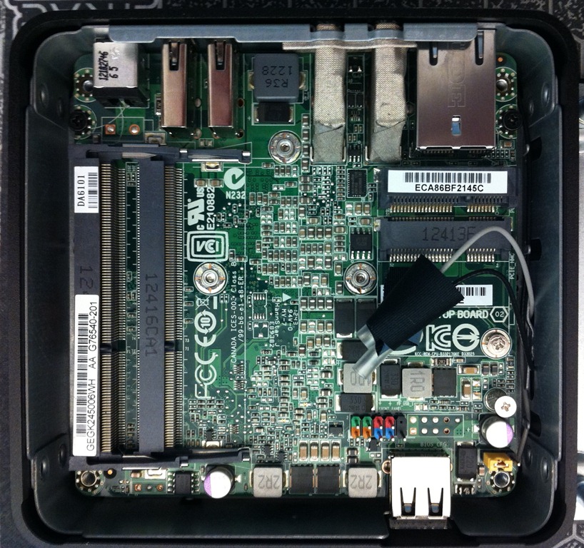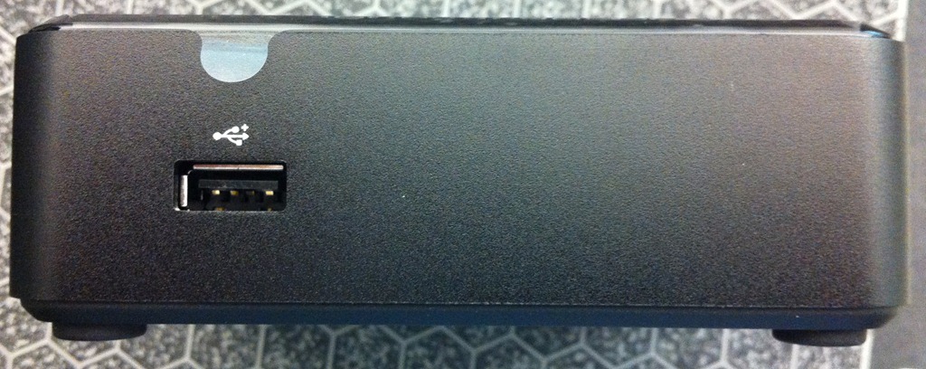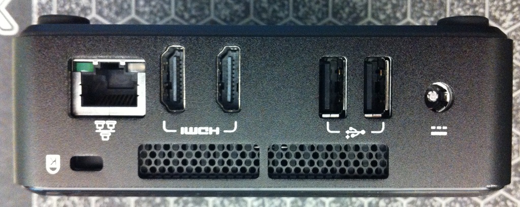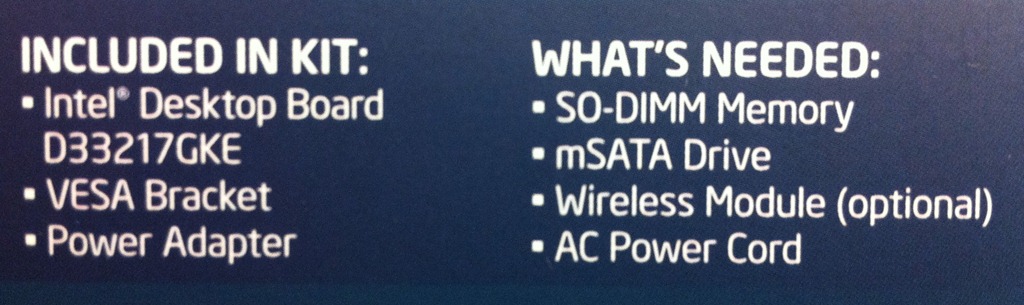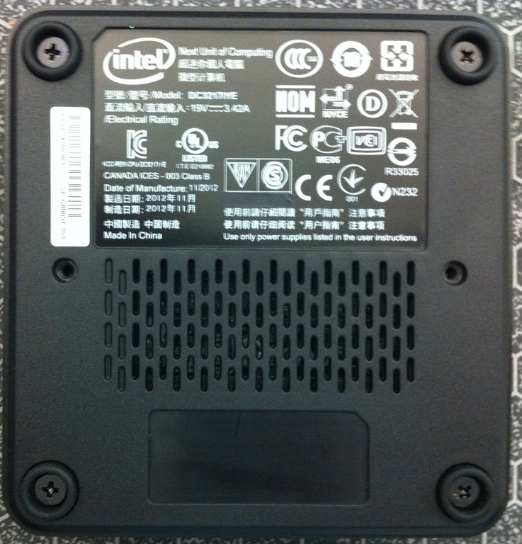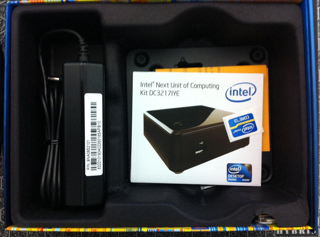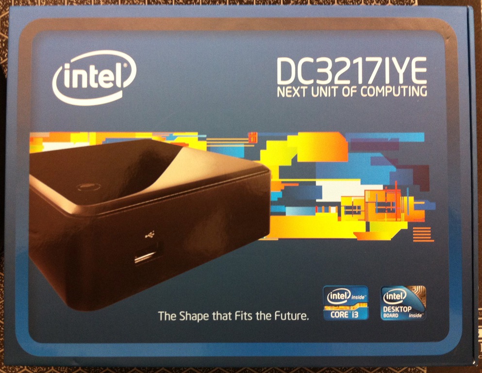 I tested one of the new Intel Next Unit of Computing devices, specifically the DC3217IYE. The device is barebones, and I used Kingston KVR16S11K2/16 16GB memory and a Kingston SMS100S2/64G 64GB mSATA card. Oh, and you need your own power cable, I happened to have a spare Monoprice 7687 3-prong power cable lying around that fit the PSU.