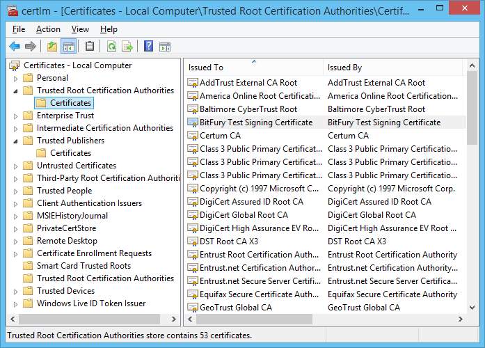 certmgr.exe -add -c "C:\BitFury\BitFuryTest.cer" -s -r localMachine root