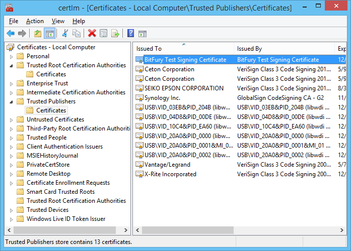 certmgr.exe -add -c "C:\BitFury\BitFuryTest.cer" -s -r localMachine trustedpublisher