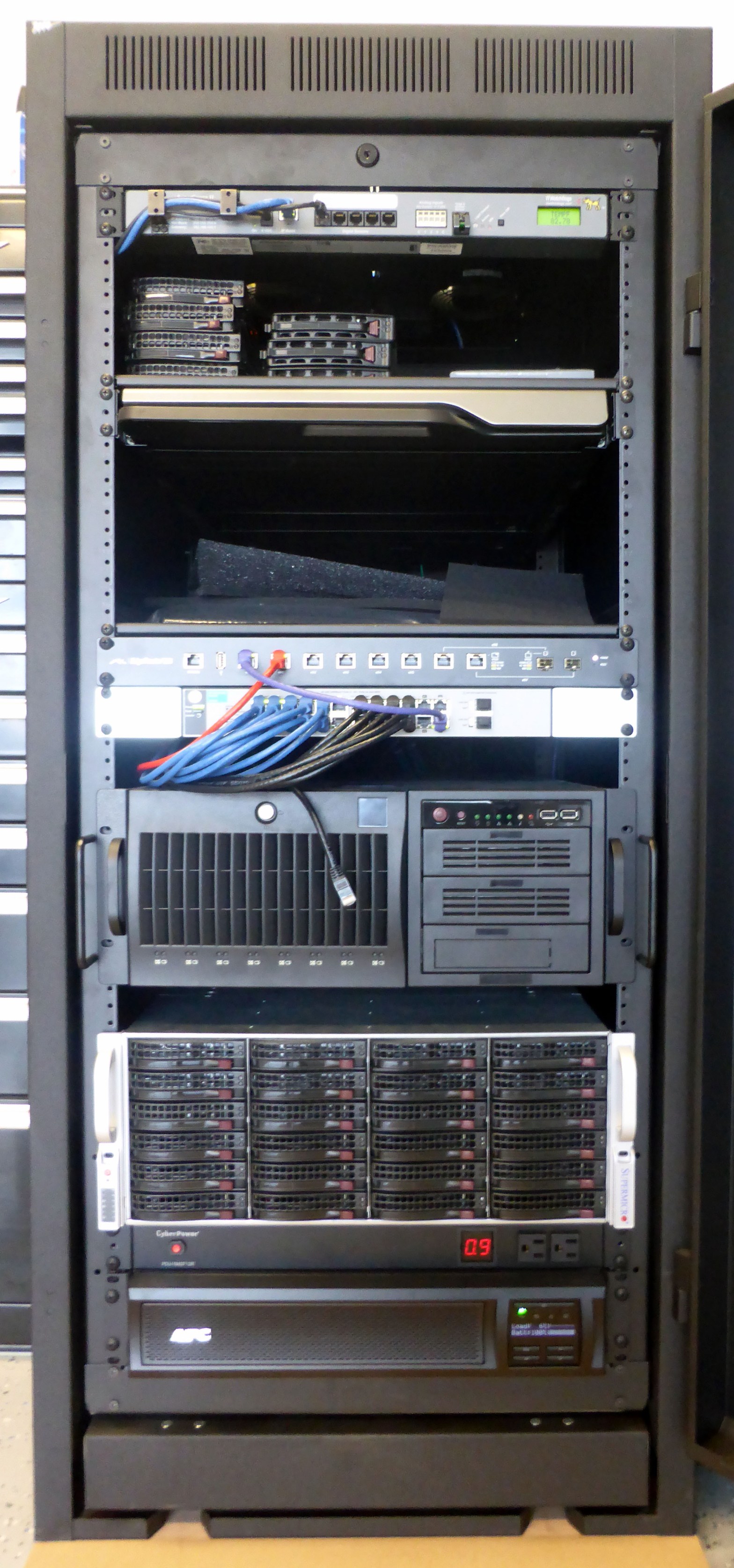 Rather than using another NAS based storage solution I opted for direct attached storage, so I was looking for a 24-bay chassis, less than 26″ in length, with low noise fans. I opted for a Supermicro 4U 24-bay SuperChassis 846BE16-R920B for the main file server, and a 4U 8-bay SuperChassis 745BTQ-R1K28B-SQ for the utility server. It was the SC846’s included rails that were too long to fit between the posts, and I replaced them with a MCP-290-00058-0N short rail set.