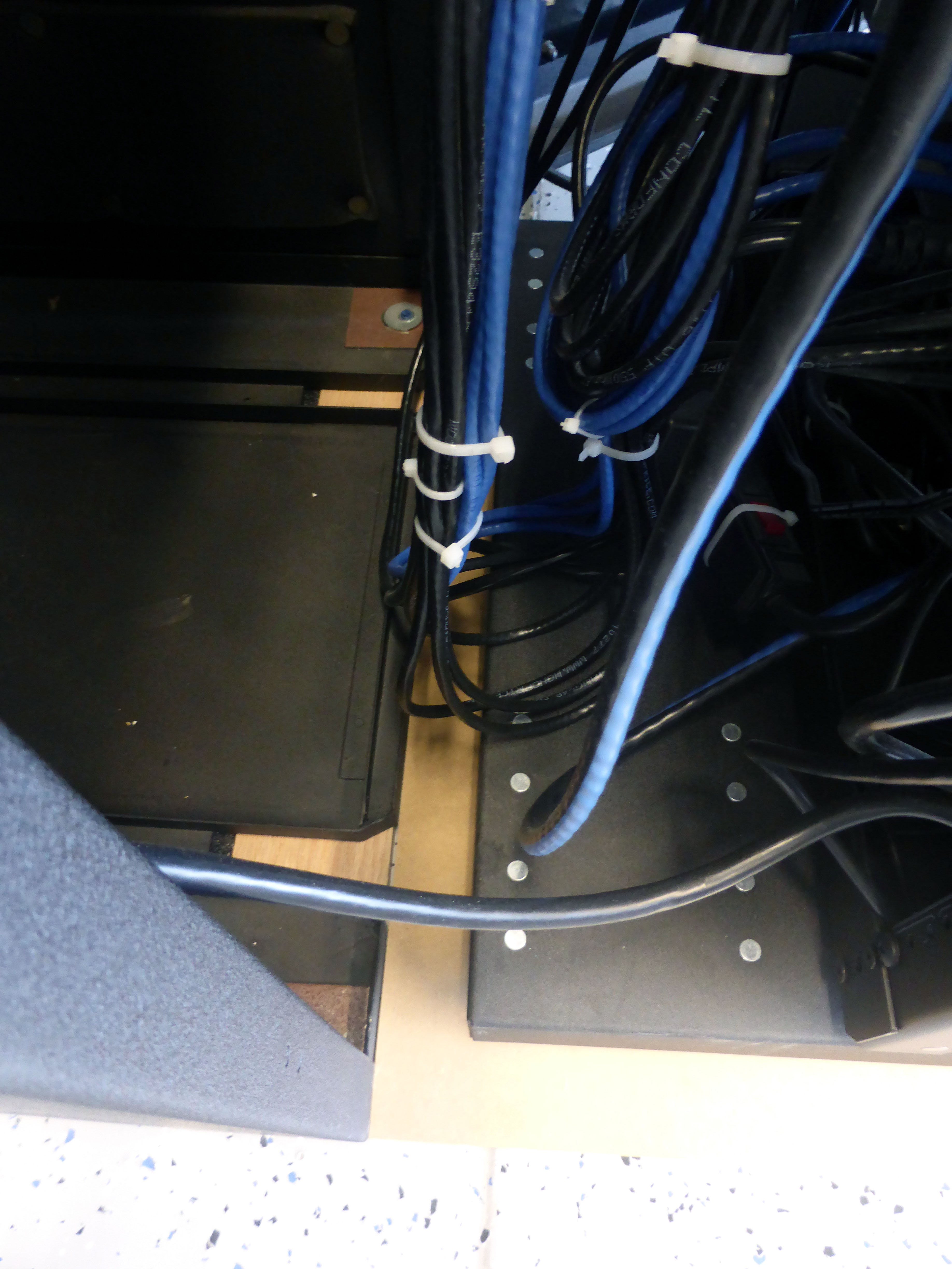 The WR-24-32 is 24U high, and accommodates equipment up to 26″ in length, quite a bit shorter than most standard racks. The interior rack assembly pillar bars are about 23″ apart, with equipment extending past the pillar ends. This turned out to be more of a challenge than the 26″ equipment length constraint. When the rack is in its outside rotated position, the 23″ pillars just clears the enclosure, but the 26″ equipment sticking out past the pillars do not, and prevents the rack from rotating. This requires brute force to lift the castors, and a very heavy loaded rack, over the rail edge and pull the enclosure out all the way before the rack would rotate freely.