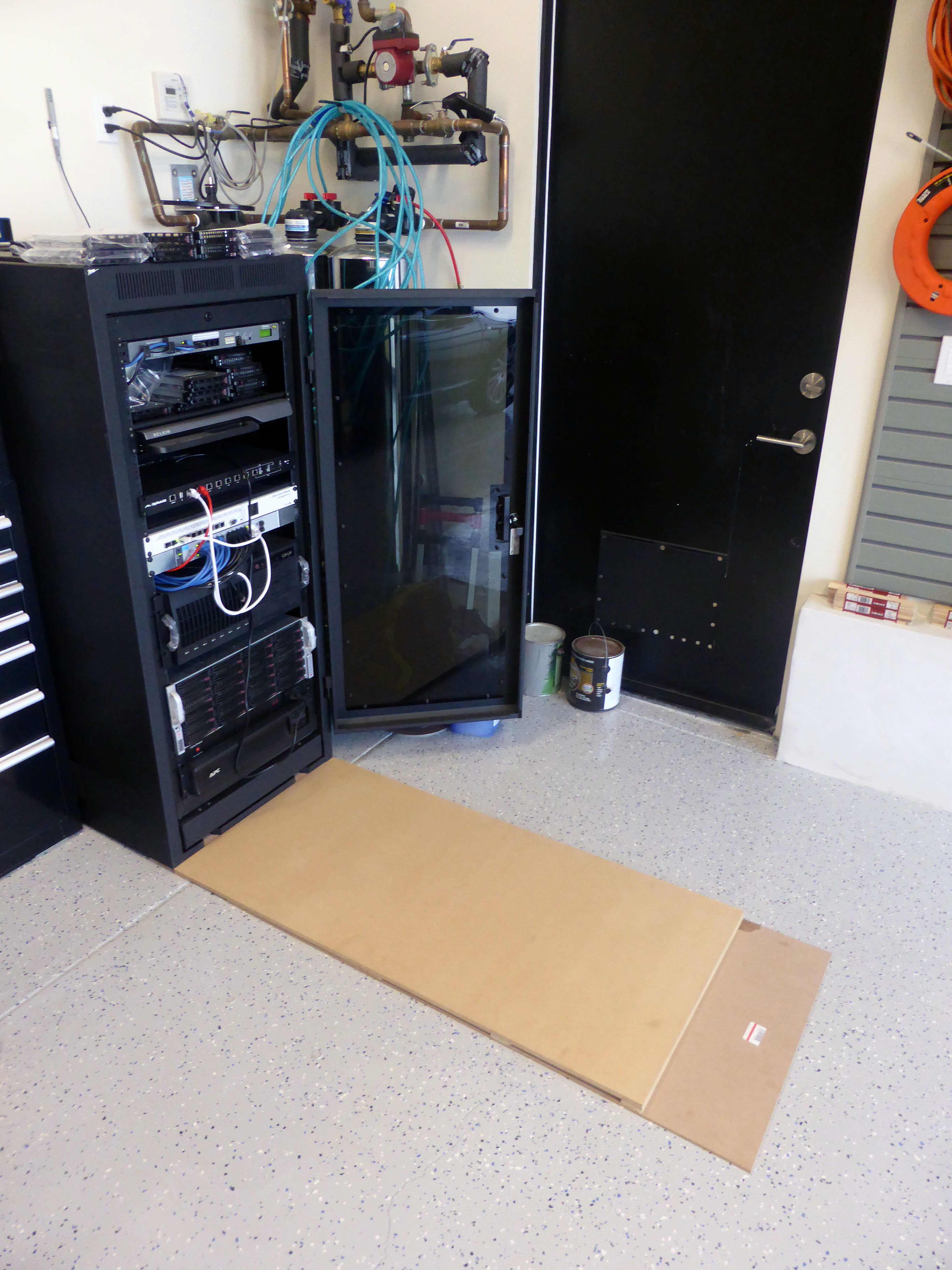 One of my primary objectives was to move the server equipment to the garage in an enclosed server rack, with enough space for expansion and away from dust. A garage is not really dust free and does get hot in the summer, not an ideal location for a server rack, but better than finding precious space inside the house. To keep dust to a minimum I epoxy coated the floor and installed foam air filters in the wall and door air inlet vents. To keep things cool, especially after parking two hot cars, I installed an extractor fan. I had planned on connecting it to a thermostat, but opted to use a Panasonic WhisperGreen extractor fan rated for 24/7 operation, and I just leave it on all the time. We have ongoing construction next door, and the biggest source of dust are the gaps around the garage door. I’ve considered applying sticky foam strips next to the garage door edges, but have not done so yet.
