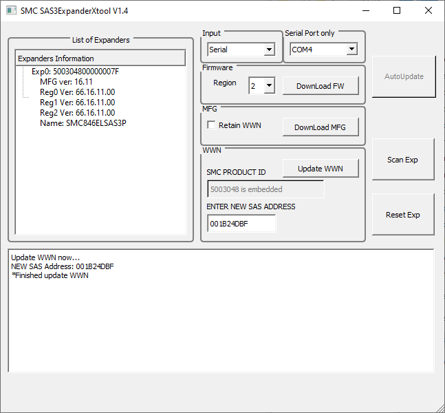 The existing firmware on the expanders were v66.06.01.02 and MFG v06.02, while the new firmware was v66.16.11.00 and MFG v16.11.