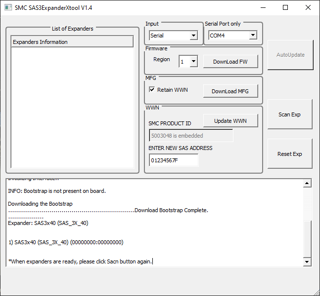 Good sign, the COM port worked, and the expander hardware was detected, but did not have an address.