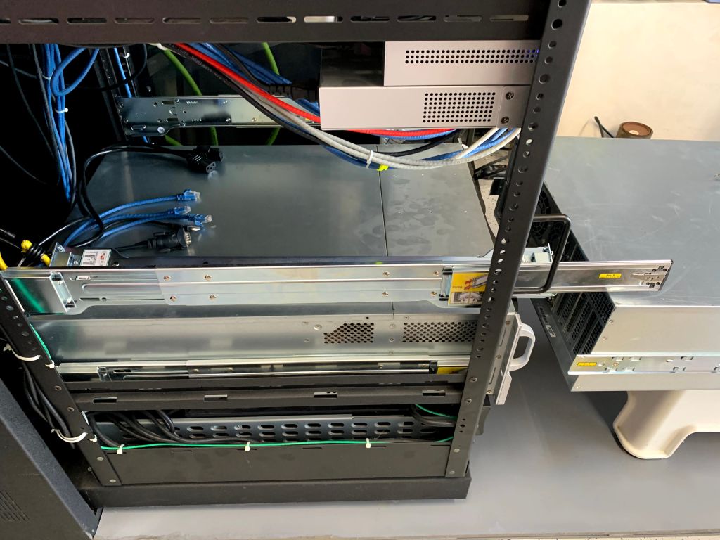I removed the motherboard from the old chassis and installed it in the new SC846. I removed the SAS2 backplane, and installed the SAS3 backplane in its place. The power cable layout on the SAS3 backplane is a bit different, and I had to use a few molex power splitters to extend the power cables to reach the power plugs on the SAS3 backplane. The standard rails are too long to fit in my rack, and the short rails are too short for the chassis, so as I again used short outer rails and standard inner rails.