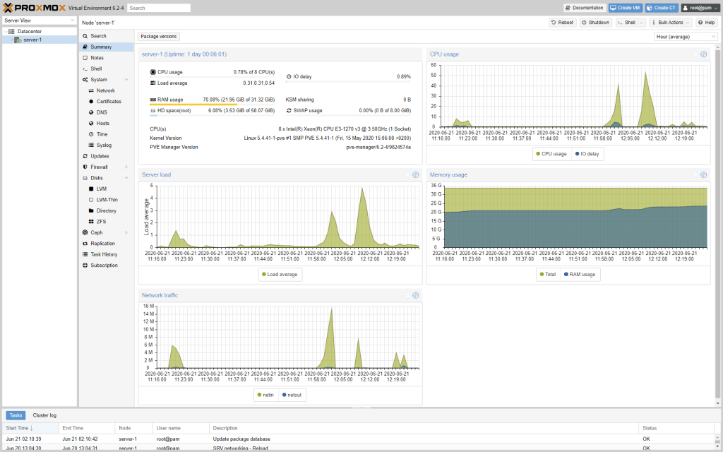 I tried Proxmox VE for the first time, it is based on Debian, includes KVM and LXC, and supports multi-server clustering capabilities (that I don’t need). It has a free and commercial support offering, with an active community, and is often cited by STH, where I first heard about it. It has a web monitoring and configuration UI, and good management UI for KVM and LXC. PVE does not include Docker or Samba, but they can be installed on the Debian host.