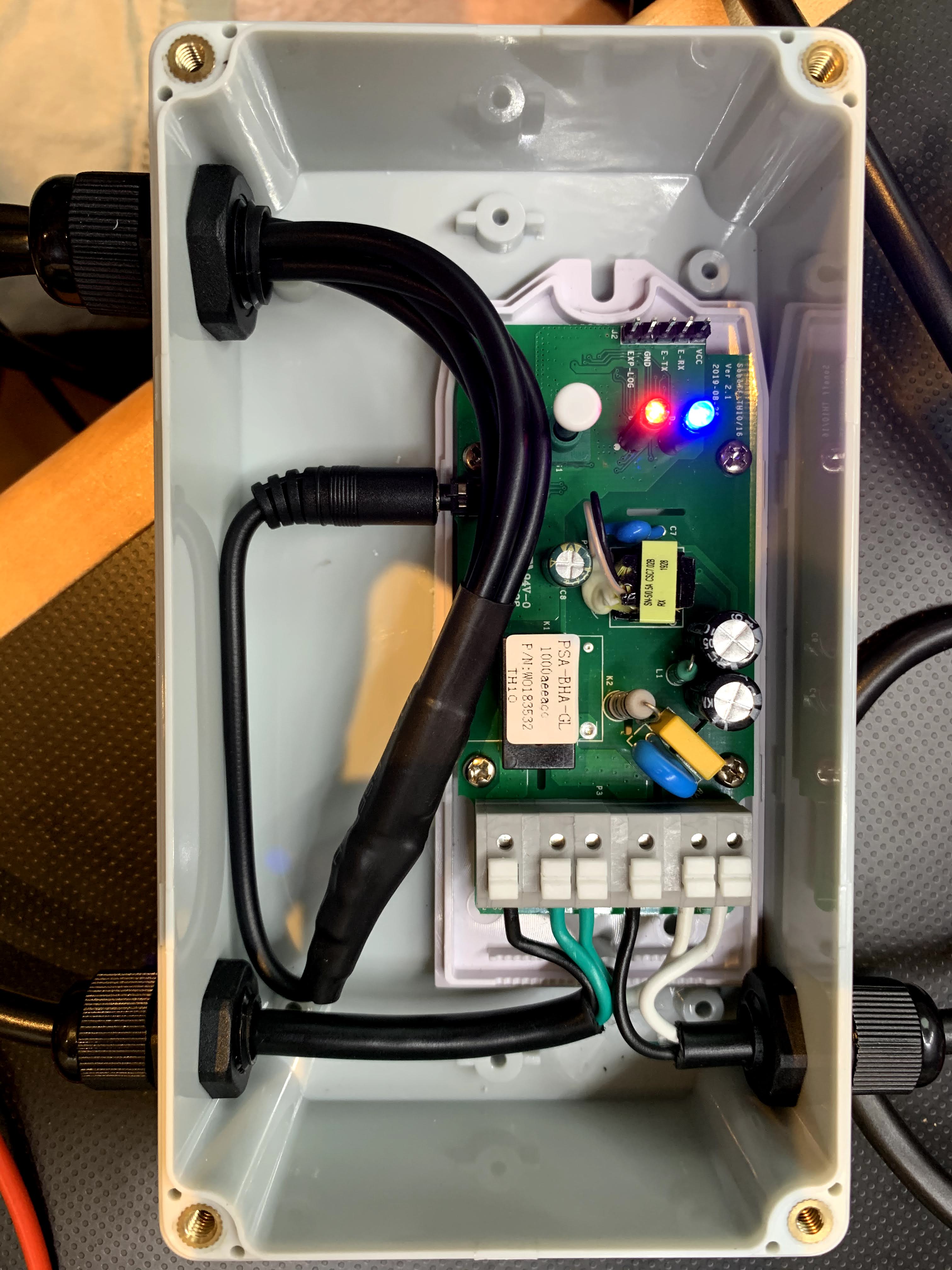 - Drill two holes in the case and mount 7mm cable glands for the power -in and -out cables.