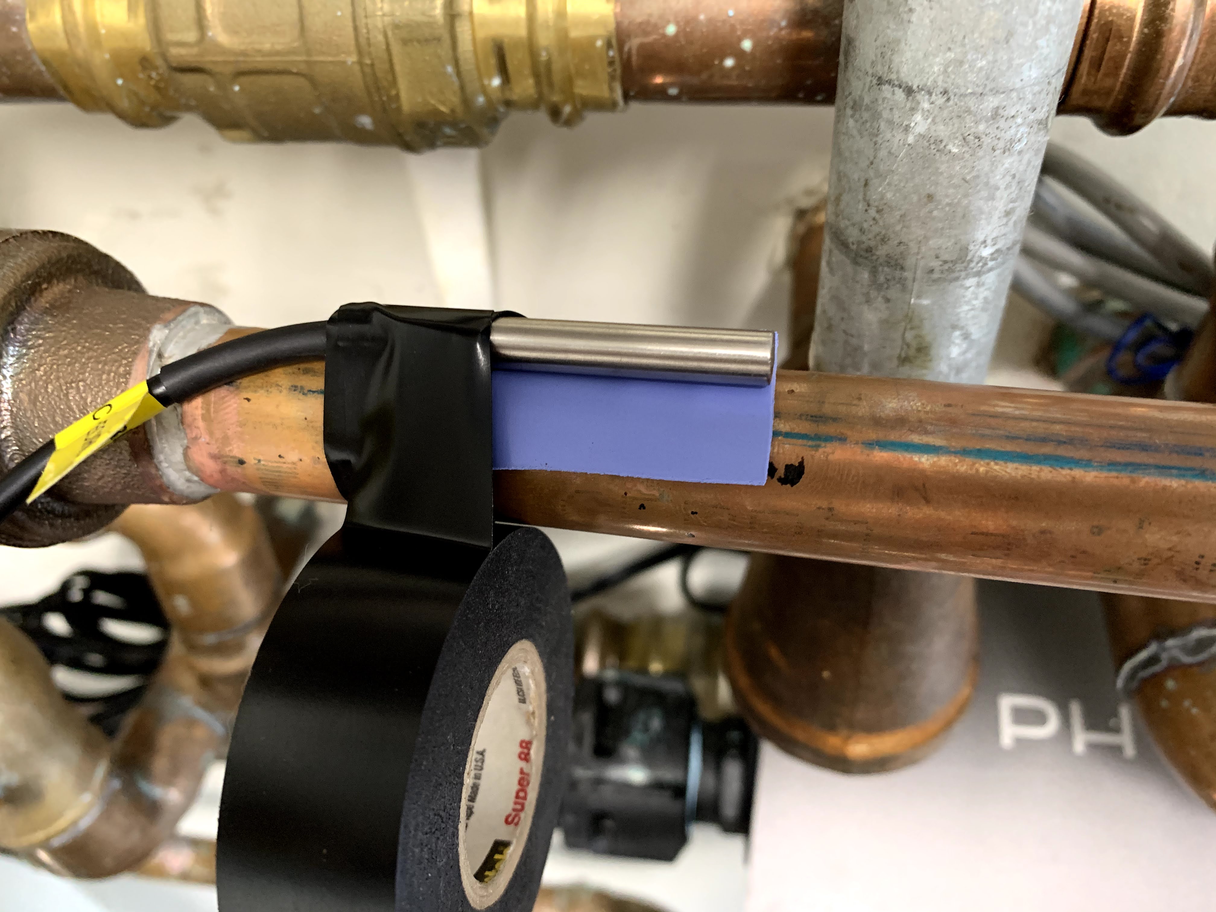 - Attach the recirculation-, hot-, and cold- temperature probes to the associated plumbing lines. Attach a thermal conductive pad between the sensor and copper plumbing, wrap using heat resistant insulation tape, and secure the sensor to the plumbing with a cable tie.