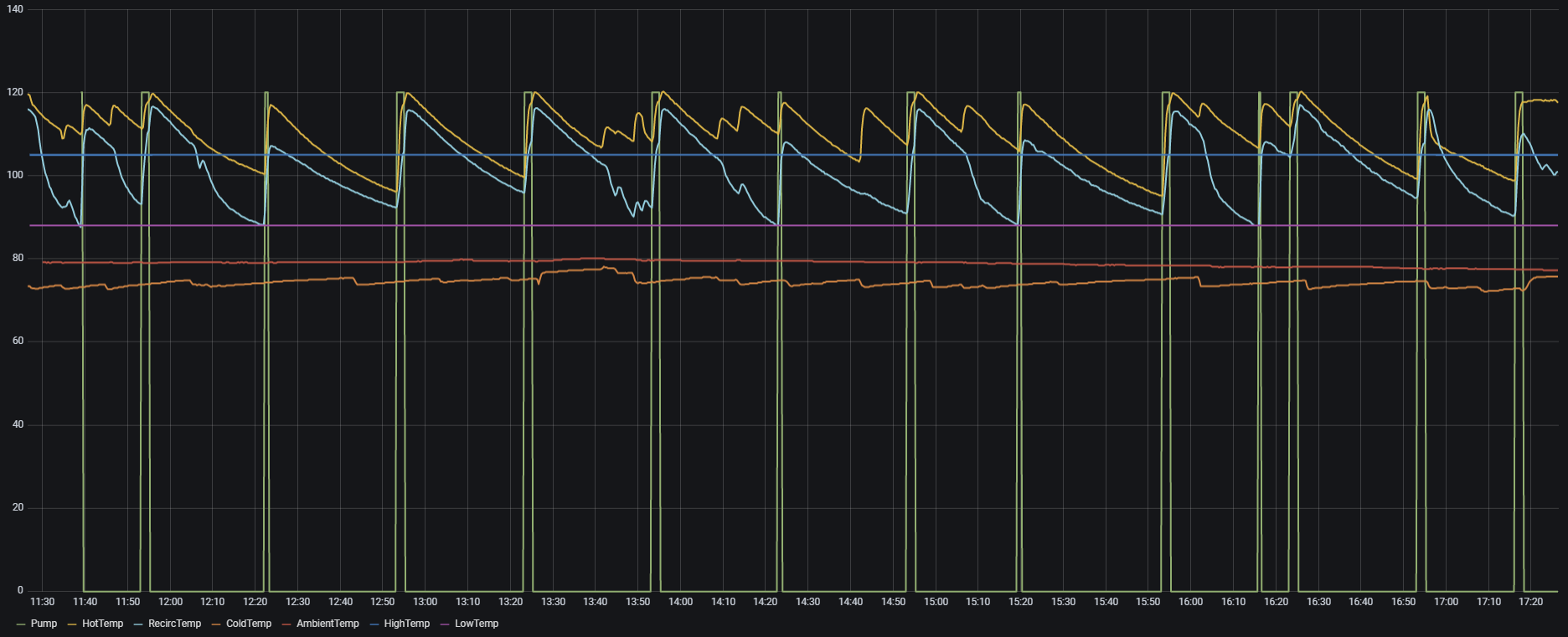 Below is a graph showing the temperatures and pump activity over a 6 hour period. It would be interesting to compare the summer pattern with a winter pattern, where I expect the thermostat to trigger more than the timer.