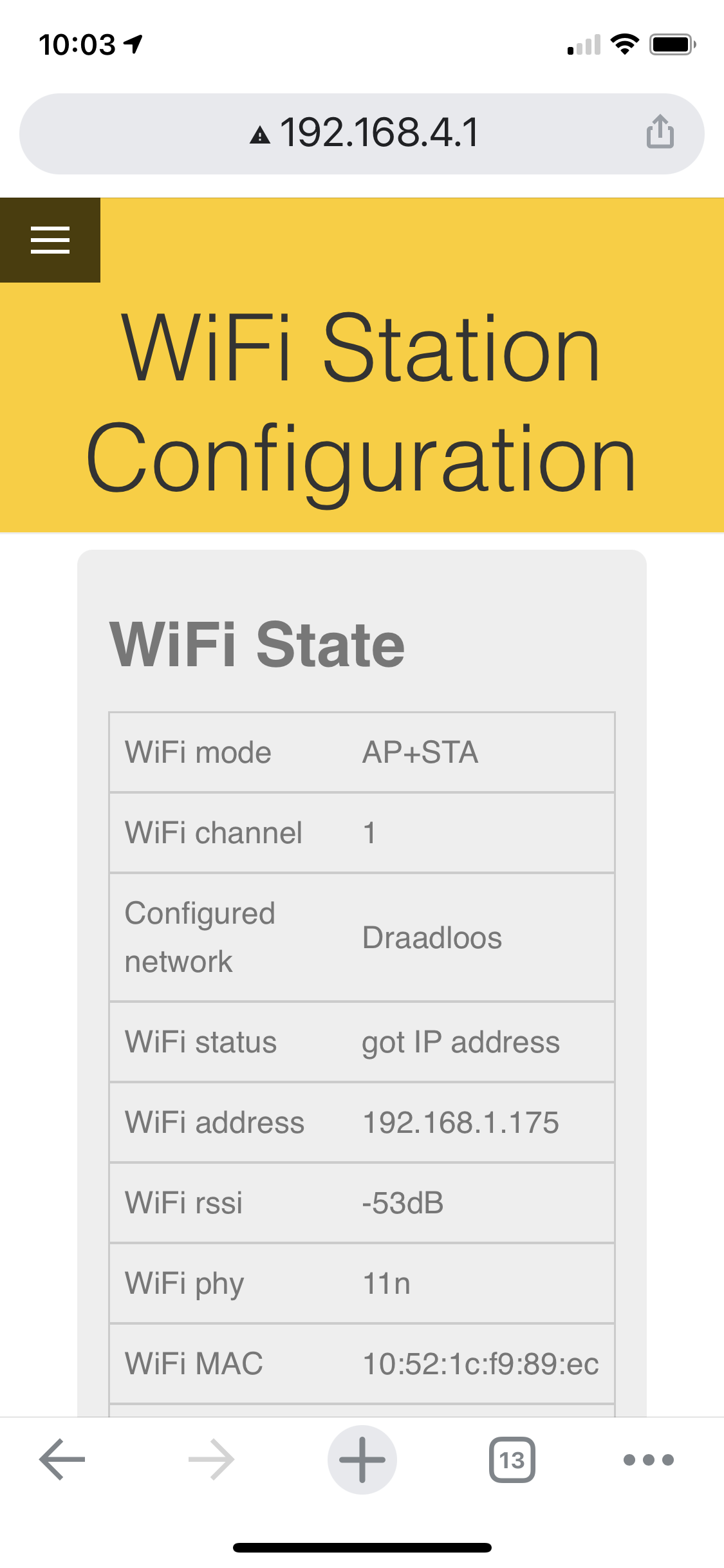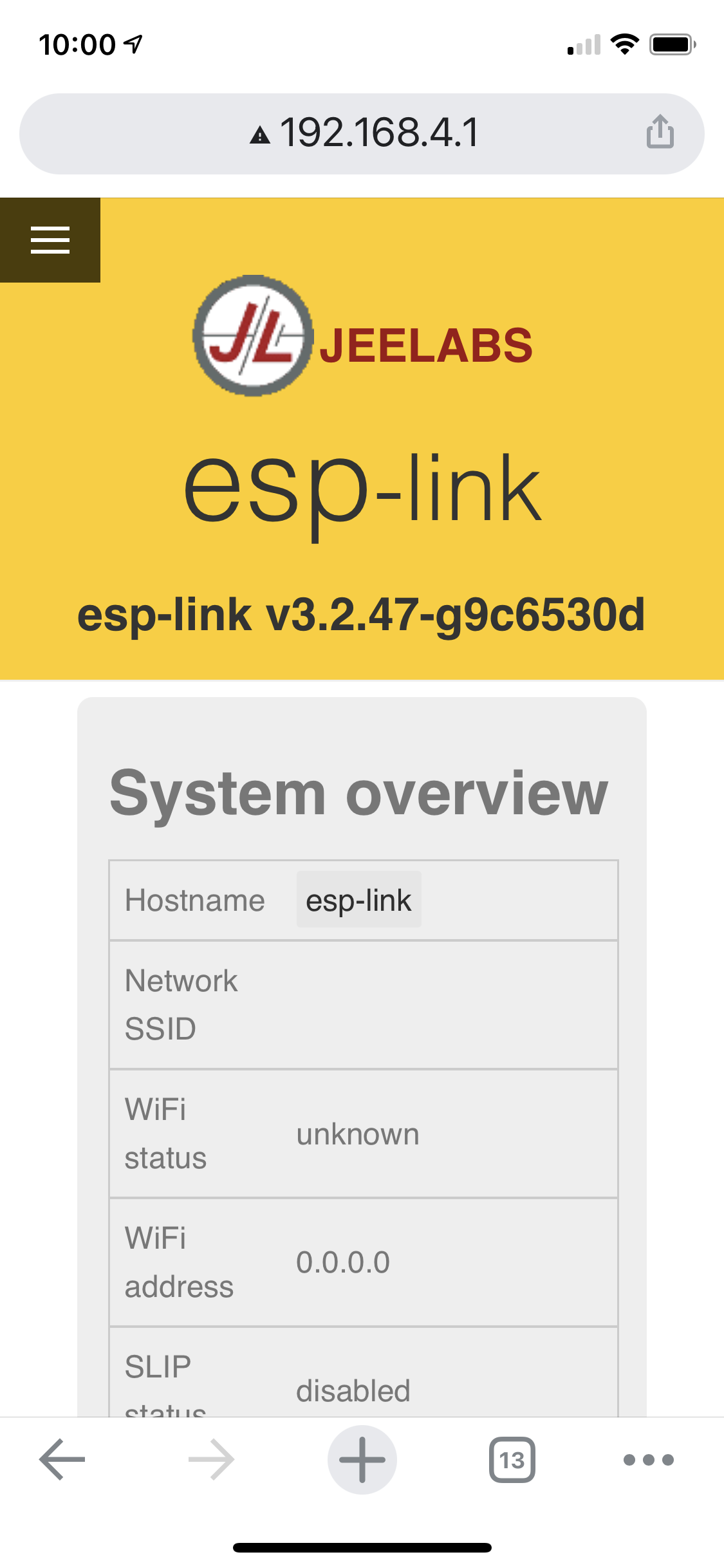 WiFi setup follows the typical steps of first connecting to the ESP in AP mode, then configuring WiFi and switching to client mode. I connected the ESP-01S to the TH10 using the pin header VCC-VCC, GND-GND, RX-TX, and TX-RX, powered on, and nothing. A bit of head scratching, re-reviewing the ESP-01S pin layout, and I forgot to pull CH_EN high, connecting CH_EN to VCC, powered on, and I got the TH10 UART monitored.