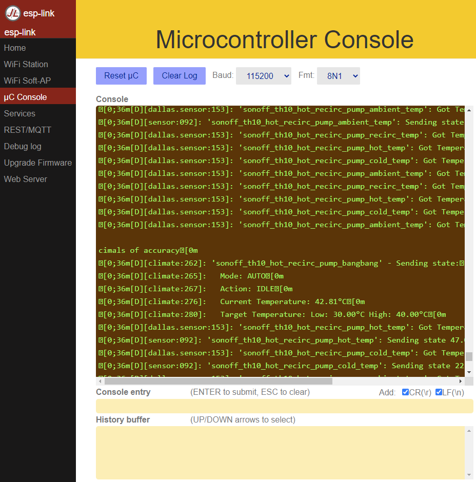 # apt update # apt upgrade # apt install socat # socat -d pty,link=/dev/ttyESP,raw tcp:esp-link:23 & [1] 1794 # esphome sonoff_th10_hot_recirc_pump.yaml logs --serial-port /dev/ttyESP INFO Reading configuration sonoff_th10_hot_recirc_pump.yaml… INFO Detected timezone 'PST' with UTC offset -8 and daylight savings time from 14 March 02:00:00 to 07 November 02:00:00 INFO Starting log output from /dev/ttyESP with baud rate 115200 [17:10:54][D][dallas.sensor:153]: 'sonoff_th10_hot_recirc_pump_recirc_temp': Got Temperature=30.9°C [17:10:54][D][sensor:092]: 'sonoff_th10_hot_recirc_pump_recirc_temp': Sending state 30.91667 °C with 1 decimals of accuracy [17:10:54][D][climate:262]: 'sonoff_th10_hot_recirc_pump_bangbang' - Sending state: [17:10:54][D][climate:265]: Mode: AUTO [17:10:54][D][climate:267]: Action: IDLE [17:10:54][D][climate:276]: Current Temperature: 30.92°C [17:10:54][D][climate:280]: Target Temperature: Low: 30.00°C High: 40.00°C [17:10:54][D][dallas.sensor:153]: 'sonoff_th10_hot_recirc_pump_hot_temp': Got Temperature=40.2°C [17:10:54][D][sensor:092]: 'sonoff_th10_hot_recirc_pump_hot_temp': Sending state 40.29167 °C with 1 decimals of accuracy [17:10:54][D][dallas.sensor:153]: 'sonoff_th10_hot_recirc_pump_cold_temp': Got Temperature=23.2°C [17:10:54][D][sensor:092]: 'sonoff_th10_hot_recirc_pump_cold_temp': Sending state 23.18750 °C with 1 decimals of accuracy [17:10:54][D][dallas.sensor:153]: 'sonoff_th10_hot_recirc_pump_ambient_temp': Got Temperature=26.6°C [17:10:54][D][sensor:092]: 'sonoff_th10_hot_recirc_pump_ambient_temp': Sending state 26.62500 °C with 1 decimals of accuracy