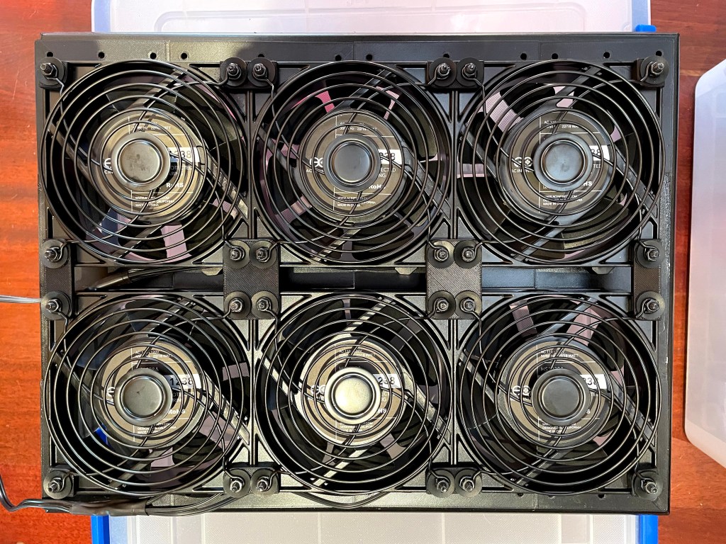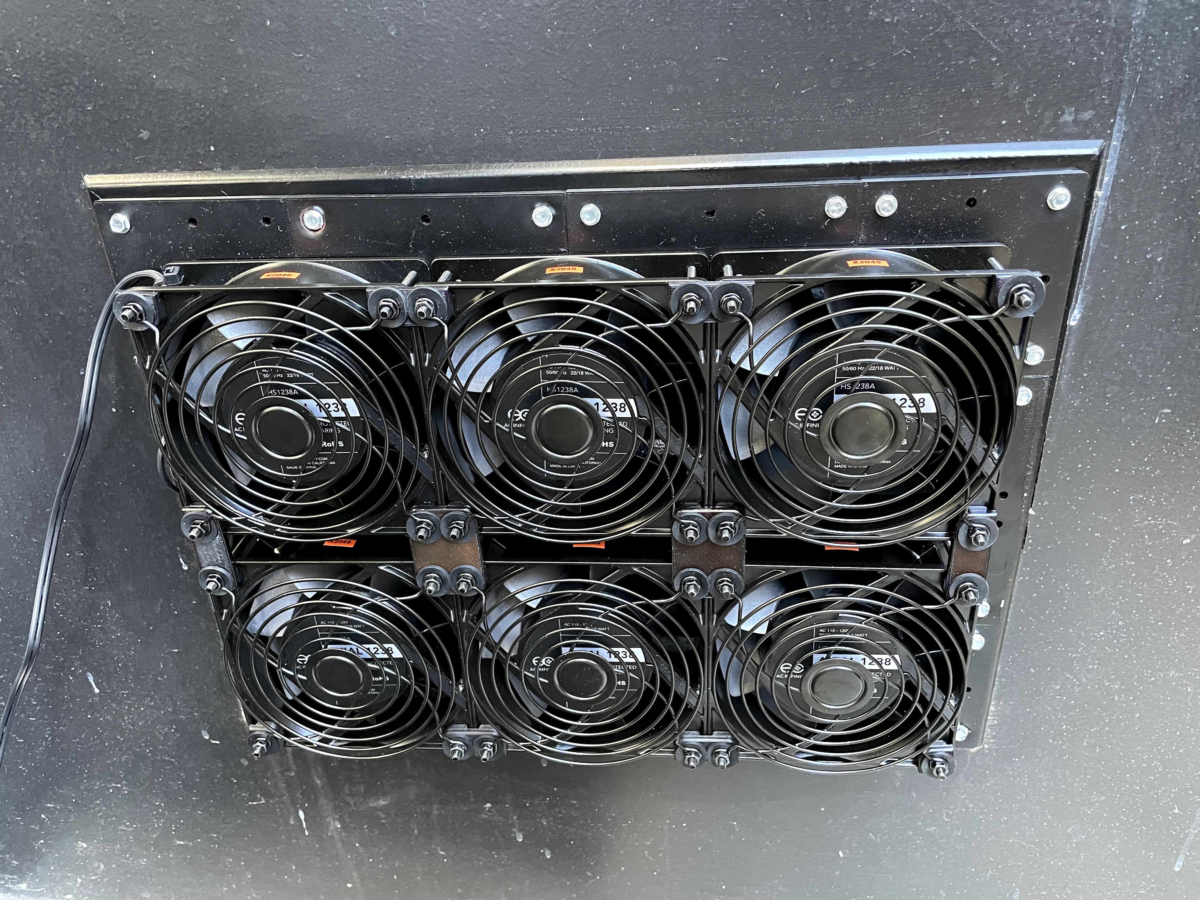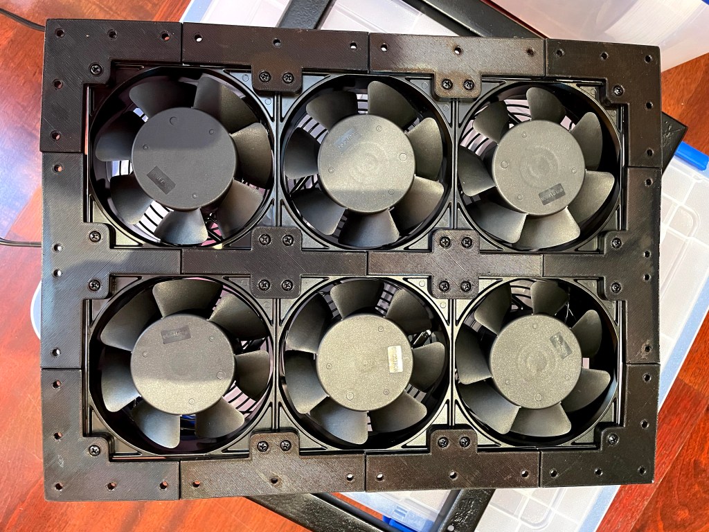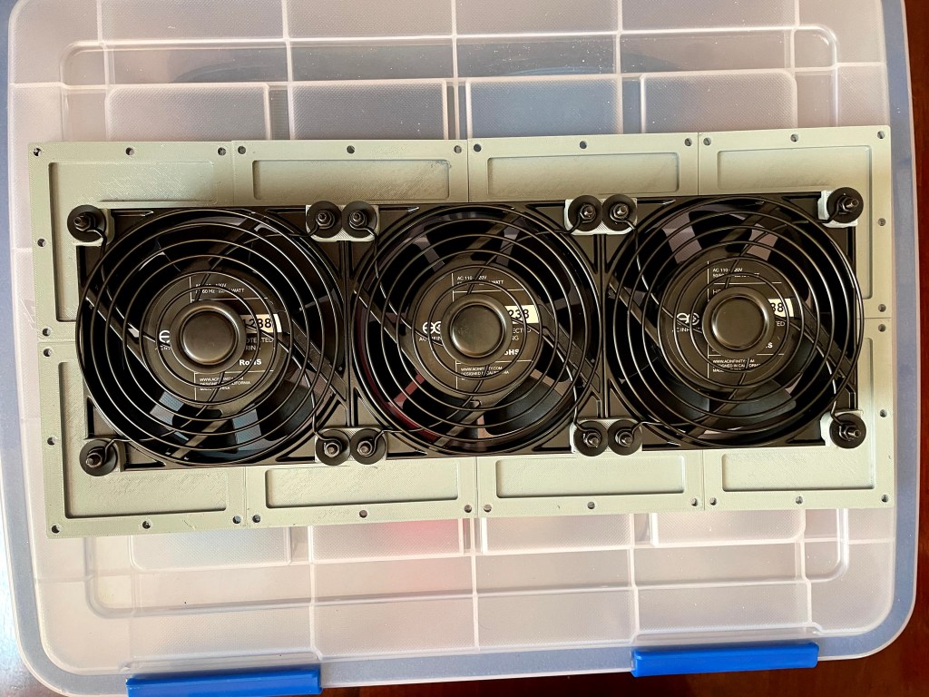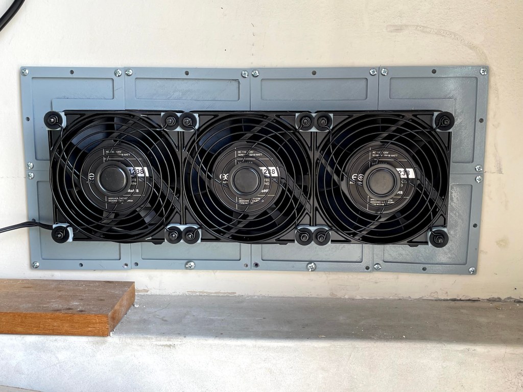 As an alternative I decided to build air intake fans mounted to the existing air ventilation slots in the alley door and lower wall. I chose to use AC Infinity AXIAL S1238 120x38mm 120V AC fans. I would have liked to use larger fans, but the 120mm fans were a good fit for a 3×1 grid to cover the wall vent, and a 3×2 grid to cover the door vent.