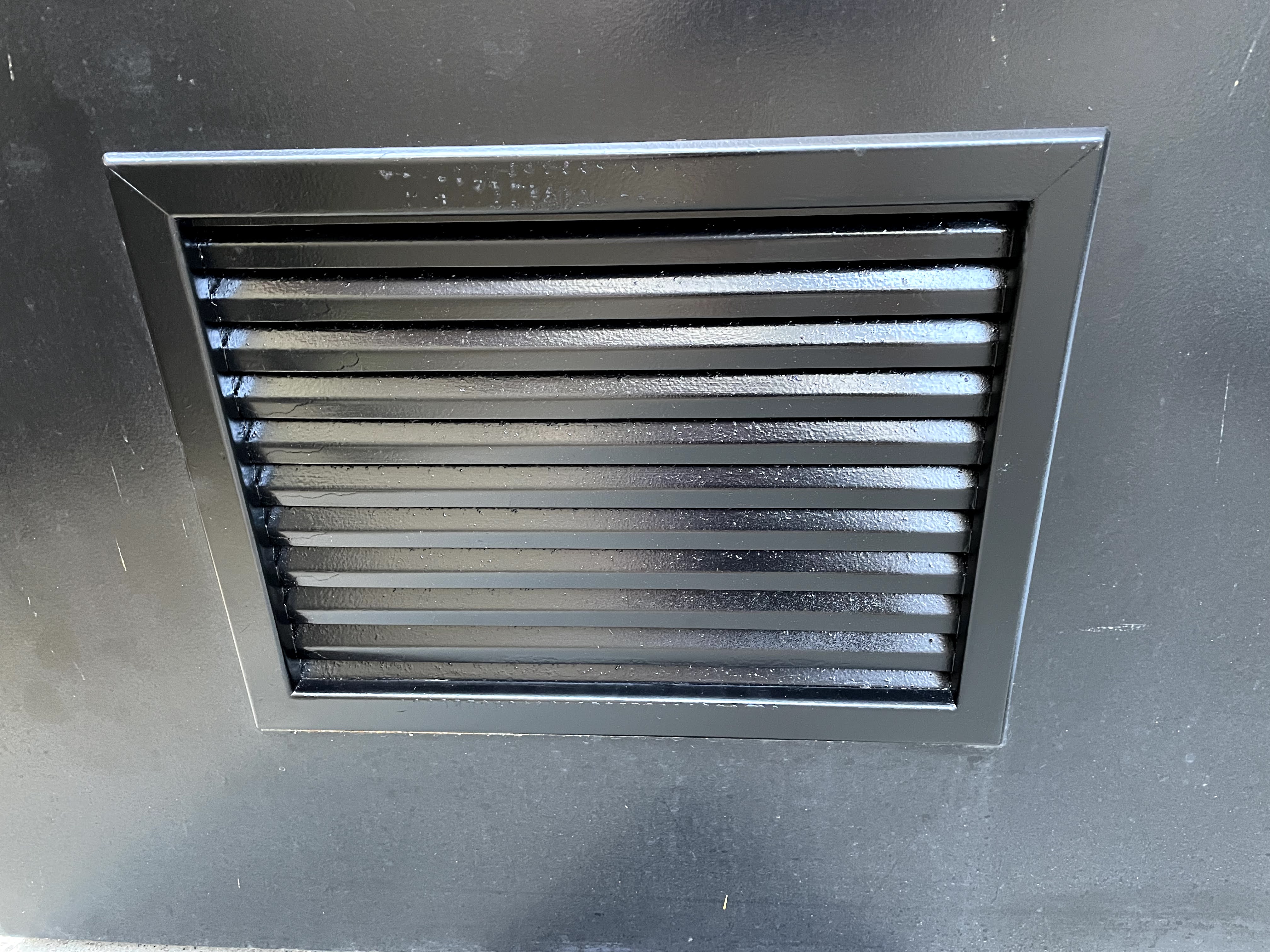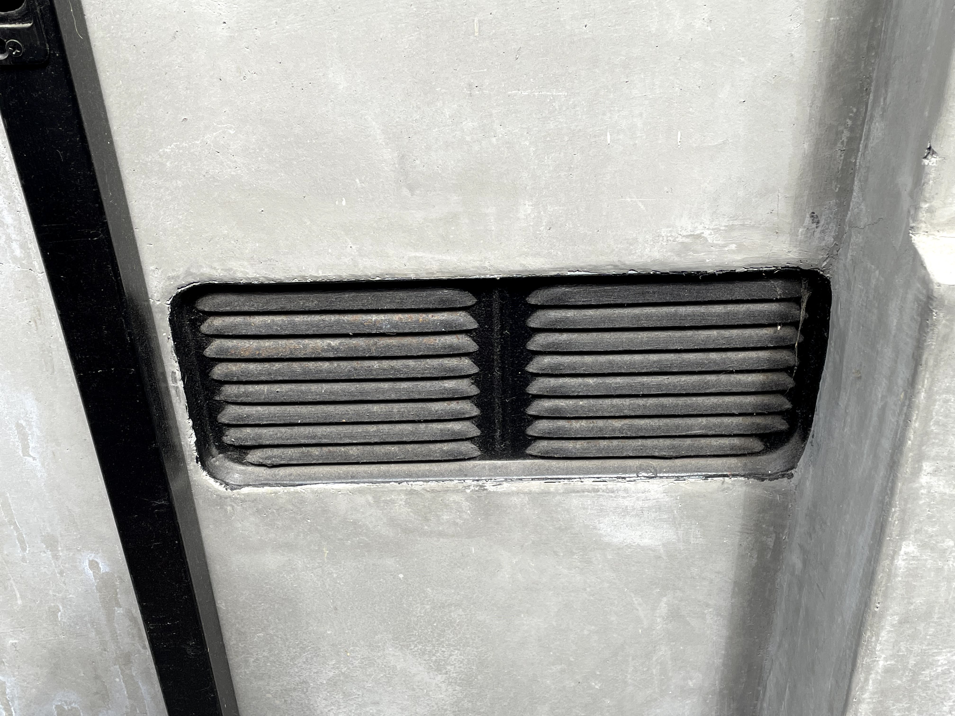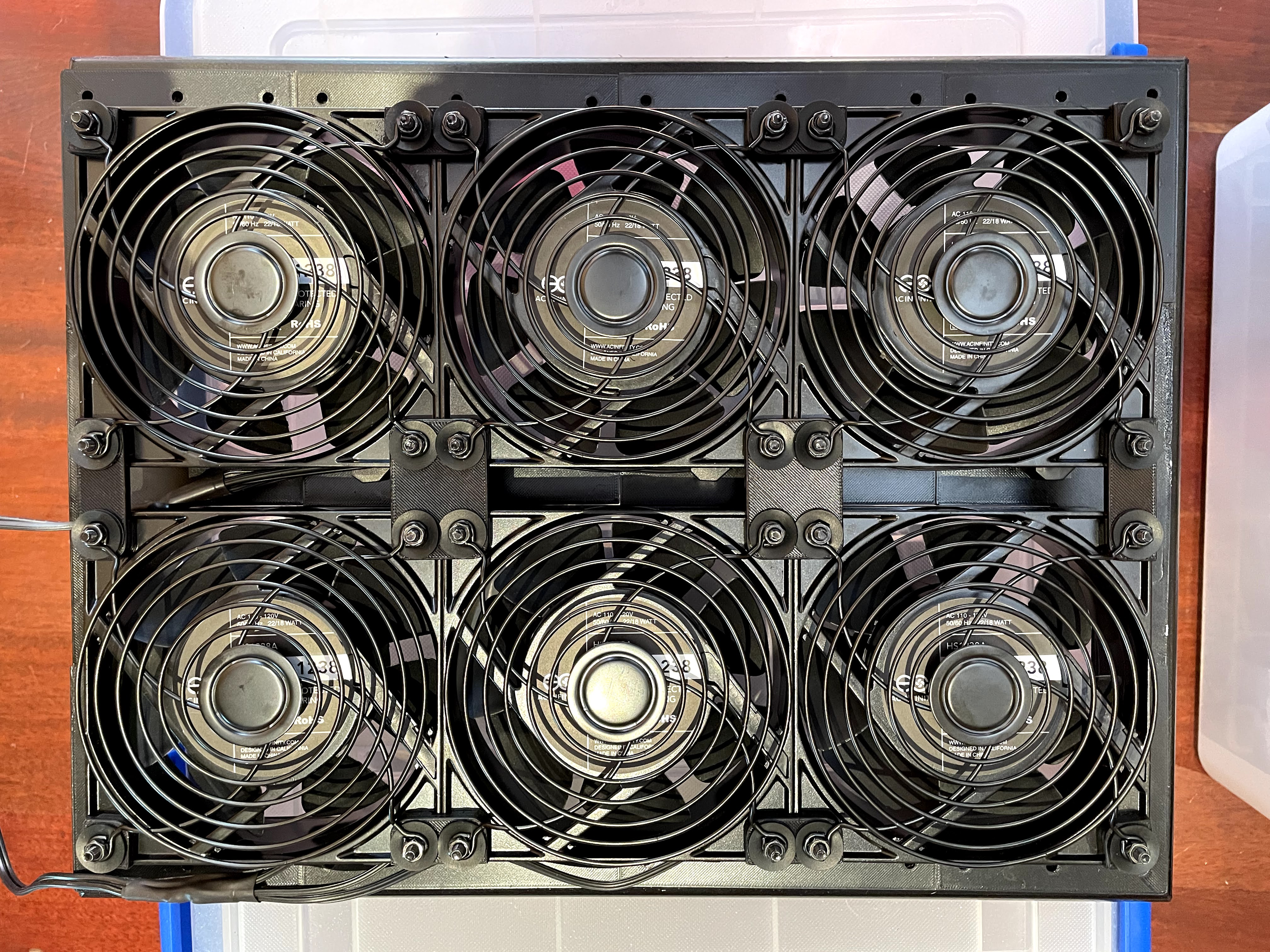 As an alternative I decided to build air intake fans mounted to the existing air ventilation slots in the alley door and lower wall. I chose to use AC Infinity AXIAL S1238 120x38mm 120V AC fans. I would have liked to use larger fans, but the 120mm fans were a good fit for a 3×1 grid to cover the wall vent, and a 3×2 grid to cover the door vent.