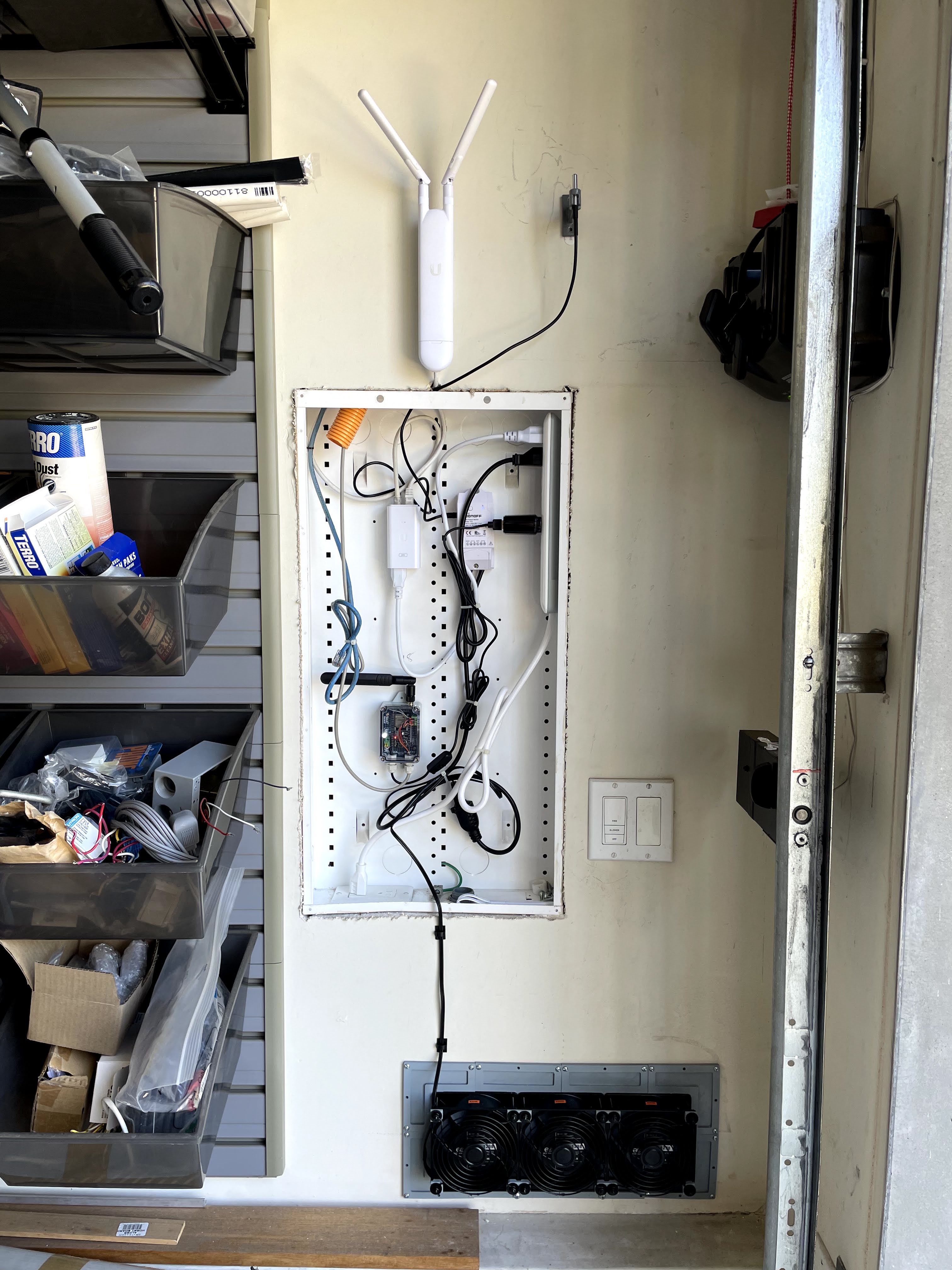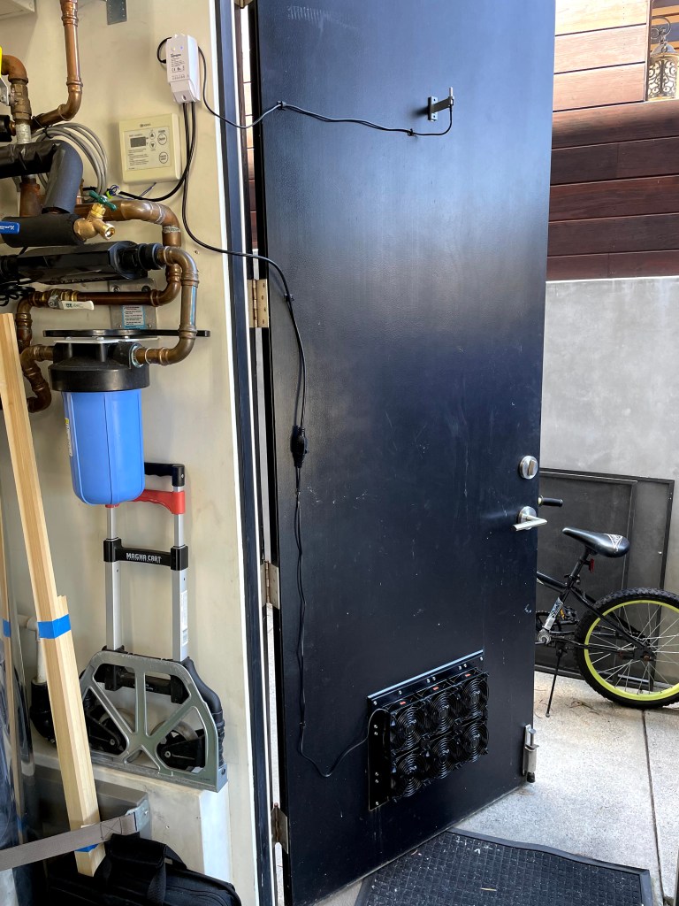 I do have a Panasonic WhisperGreen ventilation fan in the garage ceiling, but it is just not cutting it when hot cars are parked in the garage. I’ve been looking for ready-built solutions, like louvered extractor fans, but they would require cutting into stucco walls, that I know are filled with electrical cables coming from the home automation load controller.