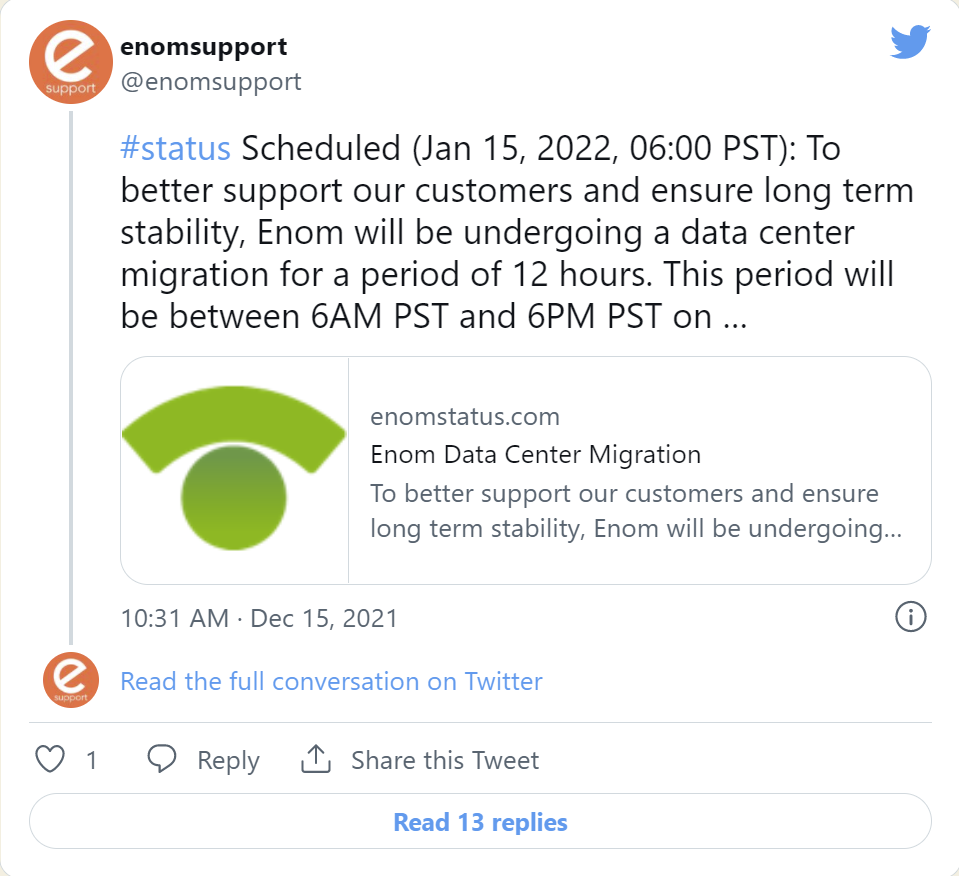- Never use eNom or any of their affiliates again. This is not the type of failure where an organization gets a second chance. Planning and executing a migration plan of this nature requires competent people, clearly they failed.