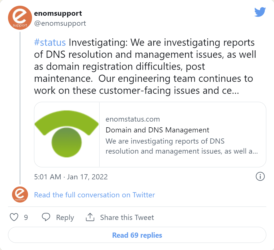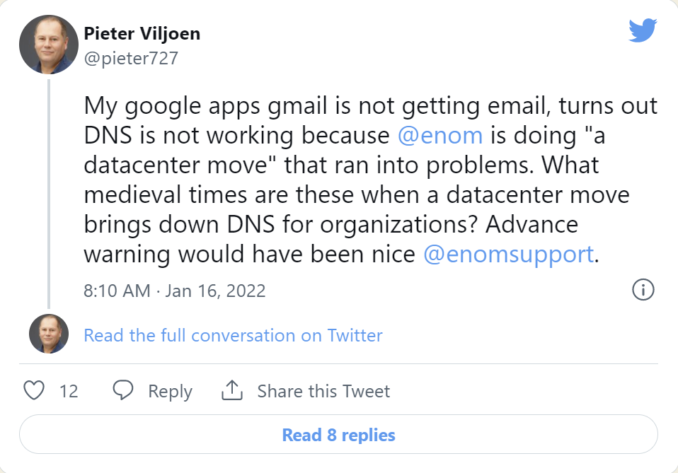 Next day (16 Jan 2022) was more of the same, more complaints, more maintenance, still can’t change DNS. I tried transferring the domain, but I couldn’t because I can’t get an email with the transfer key, as I can’t get email due to no MX records. Per canned advice from @enomsupport I sent an email to help@enom.com, from my gmail account, to this day never received a reply. Hover chat support said, sorry, need to wait for eNom.