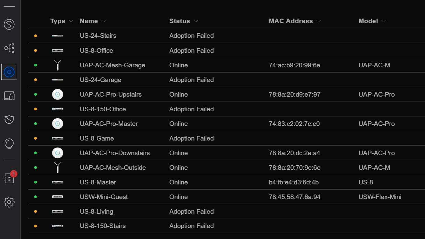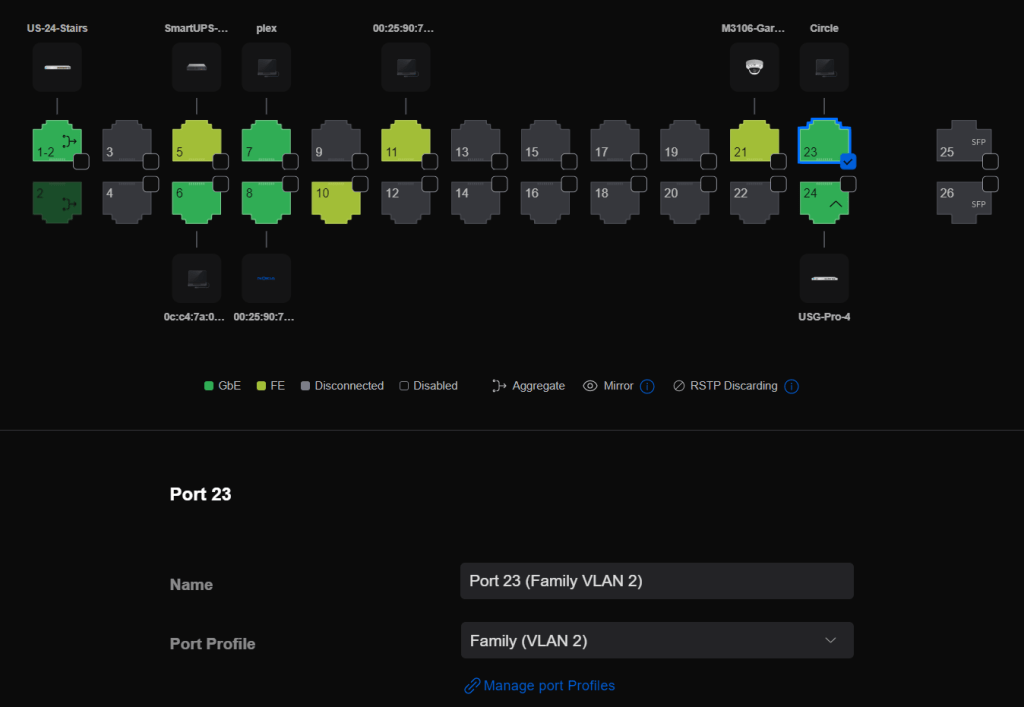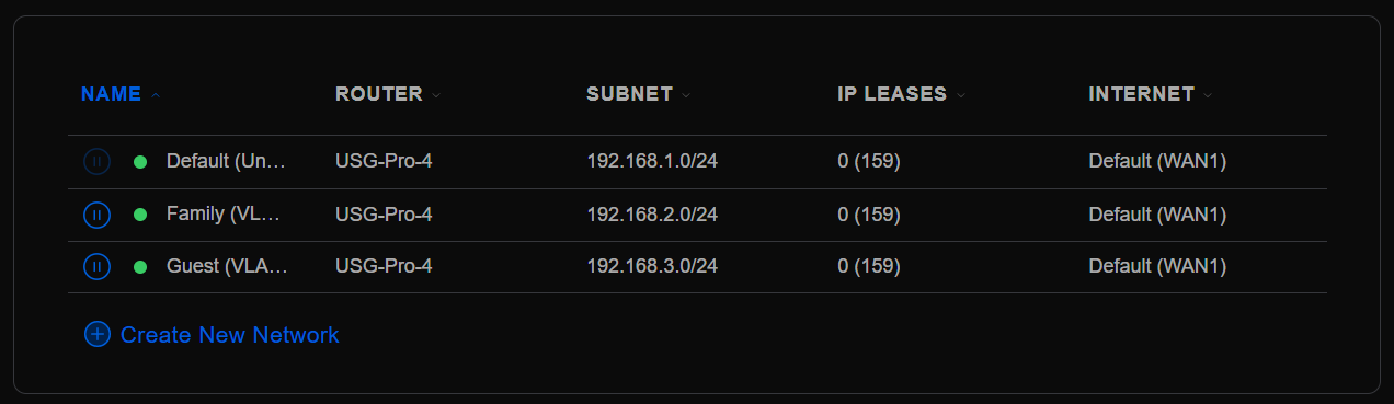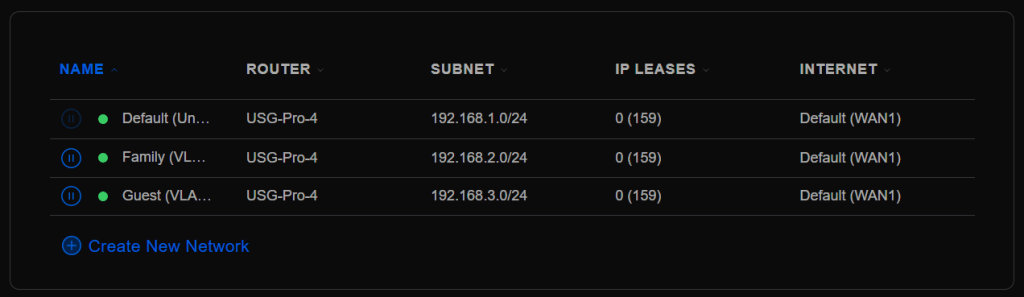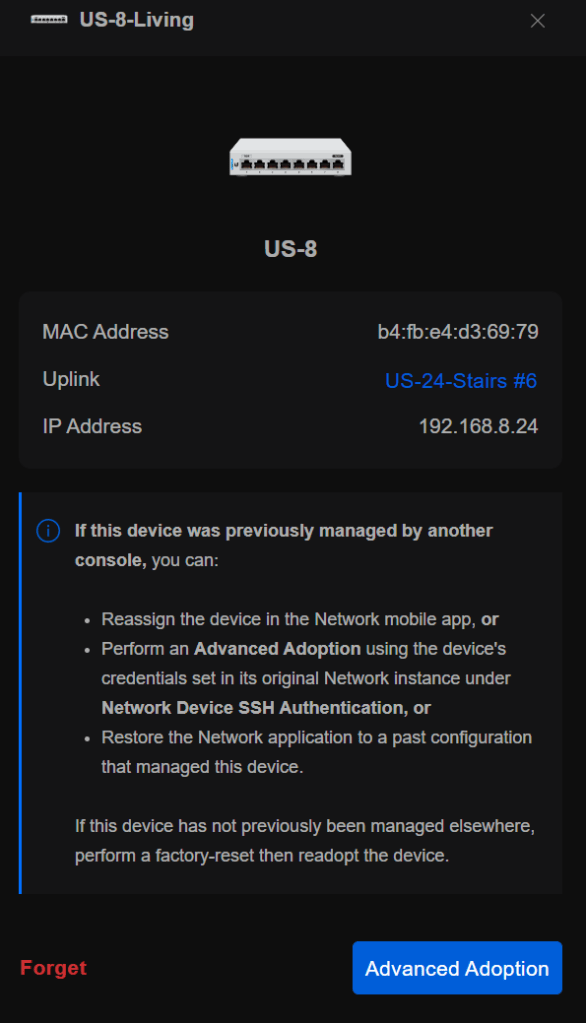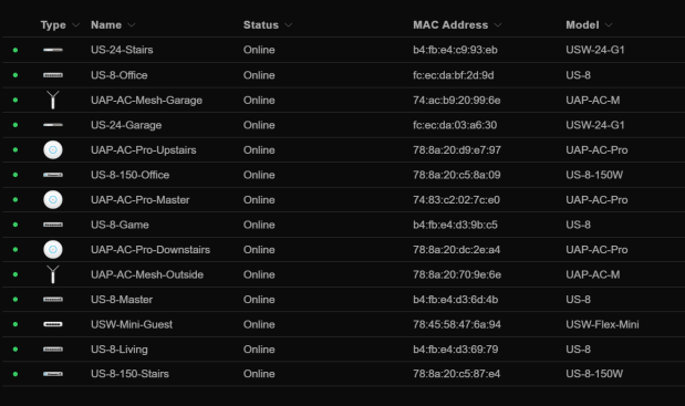 Going back to UniFi, it was not happy, it showed that most of the switches failed adoption, but the AP’s were ok. I removed the USG from the configuration, changed all the networks to no DHCP and 3rd party gateway (I should probably have done this earlier), and restarted the UniFi docker container, still failed to adopt. I noticed some of the switches reported a 192.168.8.x address, so I tried power cycling a switch, and it came back online. I did not feel like walking around power cycling all switches, so I’m going to wait and see if they come back up by themselves, maybe when DHCP refreshes, and by the next morning all devices reported online.