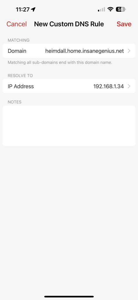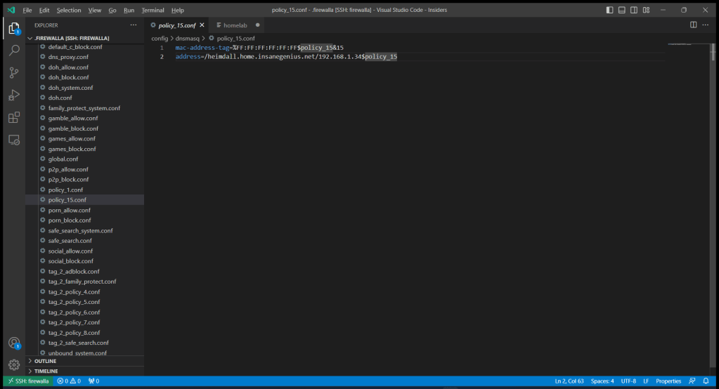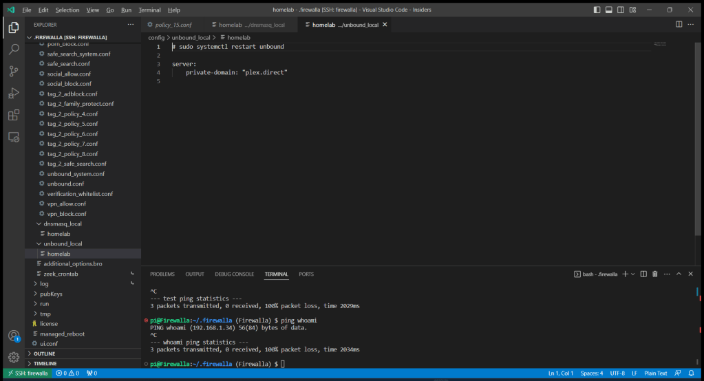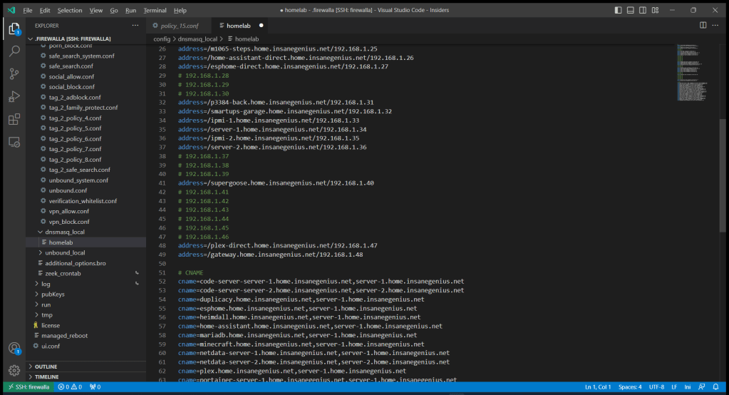 Adding DNS entries was not so simple. Firewalla has great DNS support, including DNS over HTTPS (DoH) and Unbound, but only a simple phone UI for A records. I use Ansible to configure my home lab, including lots of A and CNAME records via a UniFi configuration file, so I needed a manual alternative, or until I add Firewalla configuration support to my Ansible deployment. Firewalla runs Ubuntu and the device can be accessed via SSH, and SSH can be accessed via VSCode, alleviating the need for cumbersome CLI editing of config files. Per the docs DNS entries would typically go in ~/.firewalla/config/dnsmasq_local/, but on closer inspection the mobile app added entries show up in ~/.firewalla/config/dnsmasq/policy_15.conf. I was reluctant to mix configurations, and opted to use the file based method for A and CNAME records. (See later for an update, turns out CNAME’s did not work and I had to convert them to A records.)