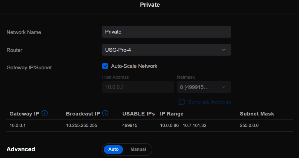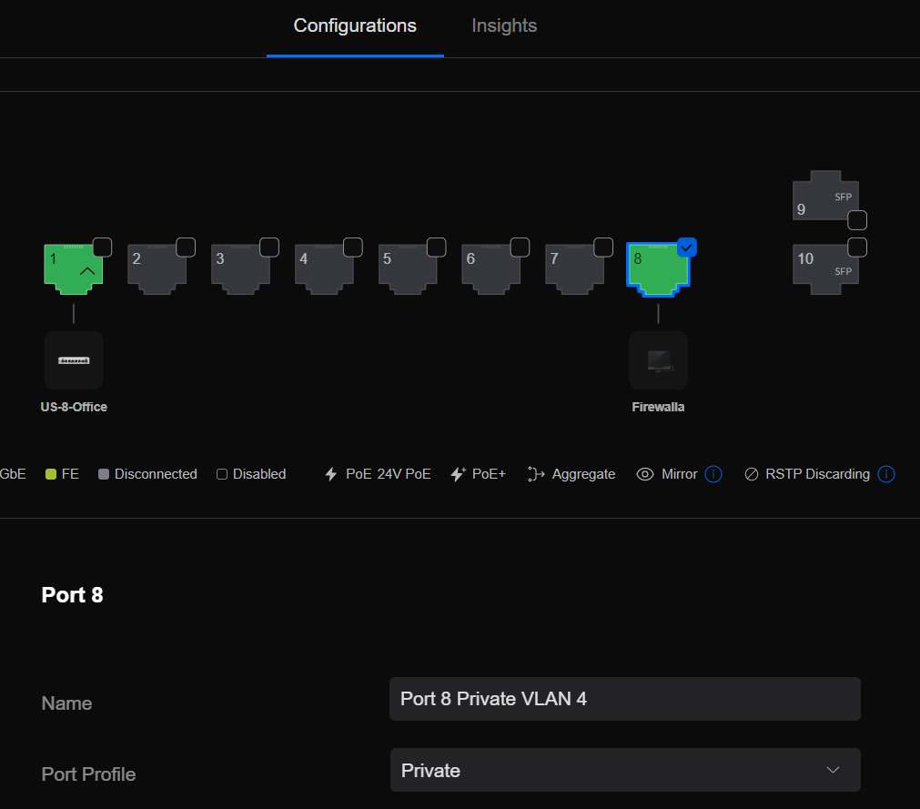 I wanted to configure the Firewalla without replacing my USG router, and without disrupting my network. I created a 10.0.0.1/8 private class A network, that would look like a NAT’ing ISP, and associated this network with a switch port. I unboxed the Firewalla, and followed the installation guide, using my “ISP network” for the WAN port, and a laptop connected to the Firewalla LAN port.