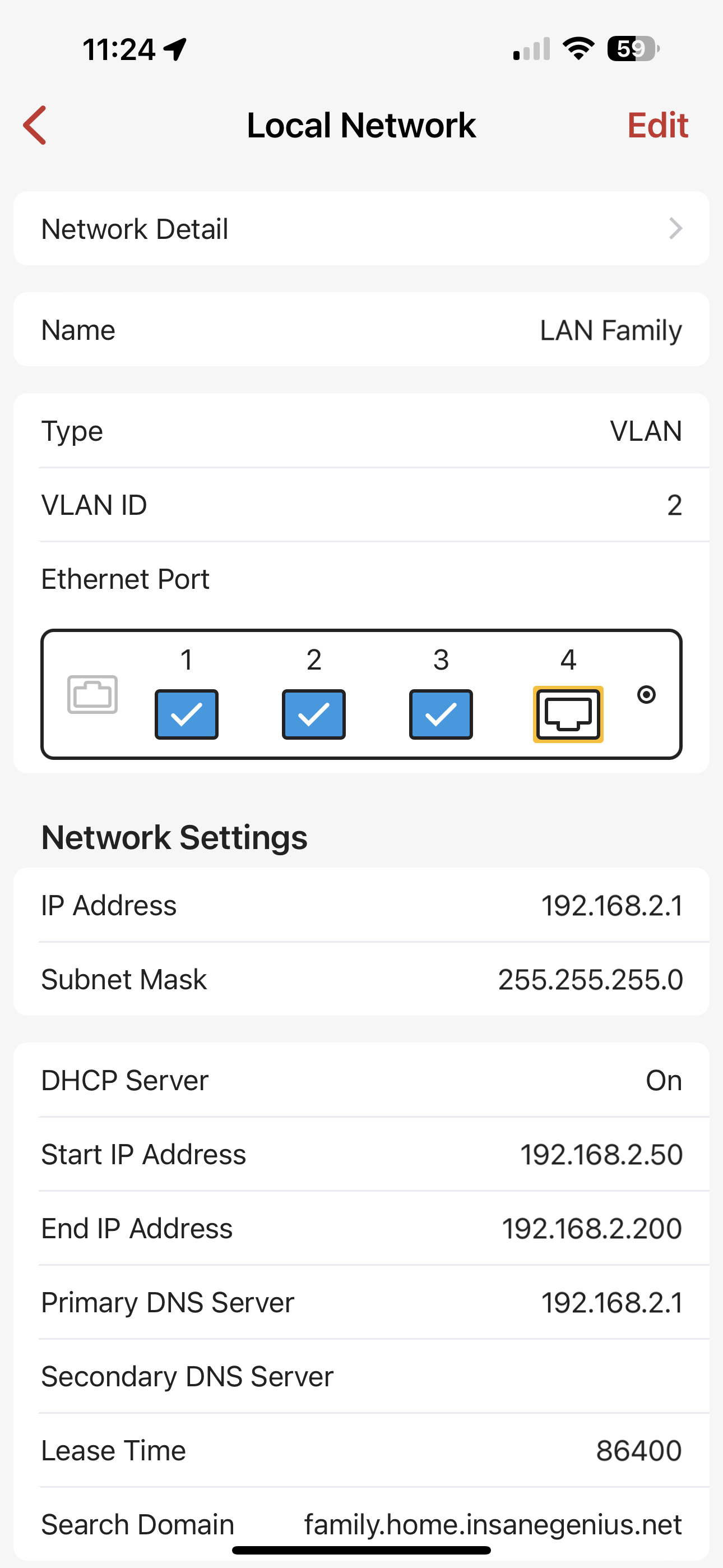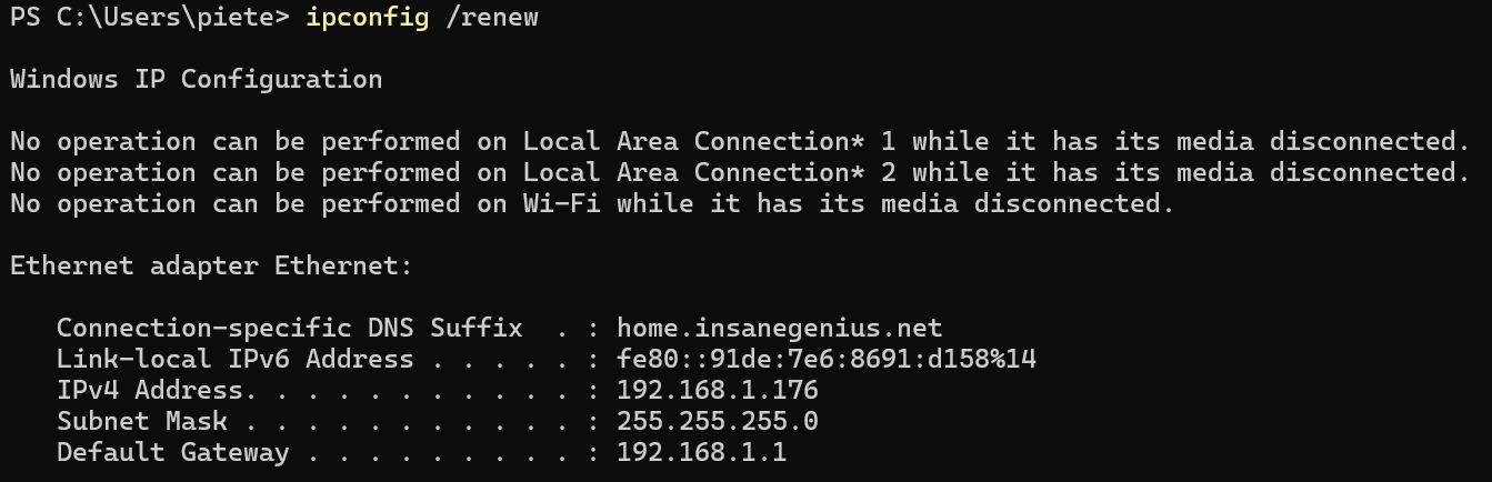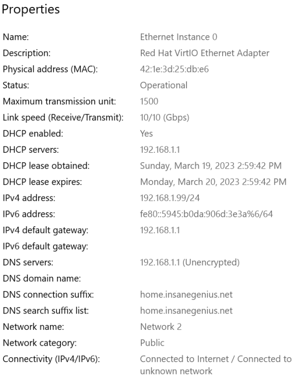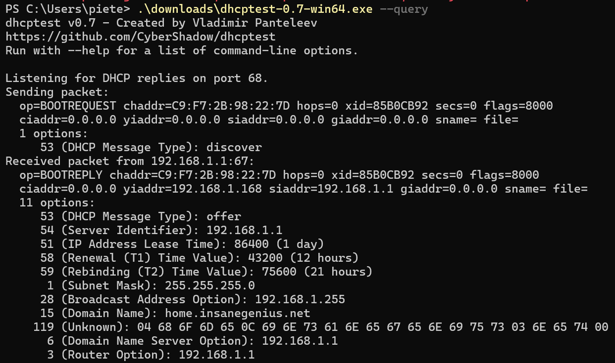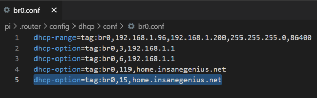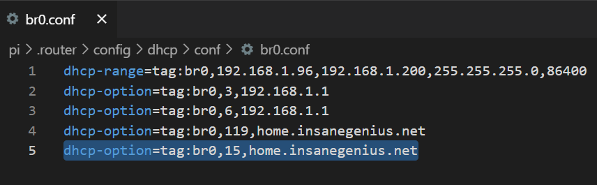 .router/config/dhcp/conf/br0.conf, and I added a domain name tag to the list of tagsdhcp-option=tag:br0,15,home.insanegenius.net - Testing shows that the domain is now correctly set on Win11, and dhcptest confirms that both tag 15 and 119 is set.