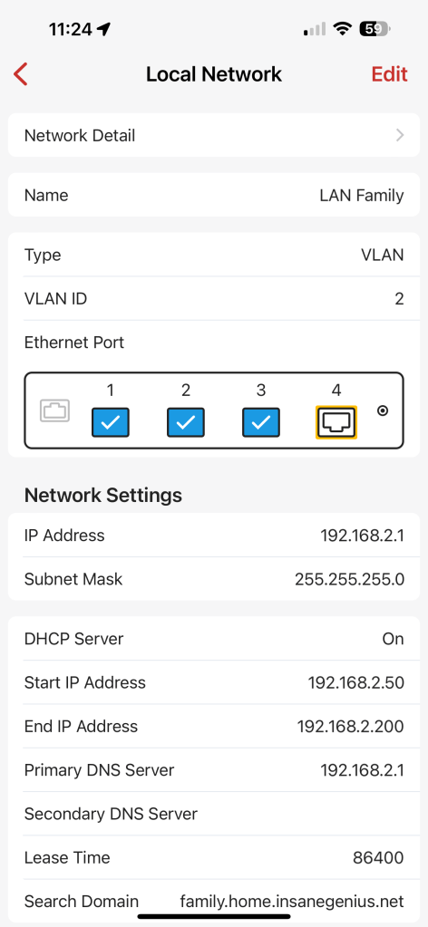 Before I get to the Firewalla, I’ll describe how I installed and configured the Circle such that it was only used for some network devices, leaving the majority of my network untouched. Circle has only one ethernet port, and uses ARP spoofing to become the network gateway. To keep the Circle and its ARP spoofing isolated from my primary network, I created a new VLAN network and new WiFi SSID to use as a parental control enabled network. I plugged the Circle LAN port into a switch with the switch port configured to the parental control VLAN, and I changed the kids devices to connect to the parental control WiFi.